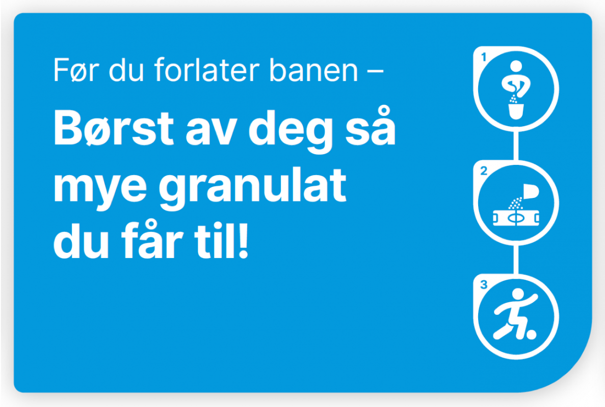 Bruk skiltene som ett verktøy for å skape en kultur rundt å holde anleggene ryddige og å holde granulatet i et kontrollert kretsløp. Skiltene vil informere om hvordan klubben ønsker å ha det, de vil inspirere til deltagelse, og de vil aktivisere brukere og spillere til å gjøre fysiske tiltak.